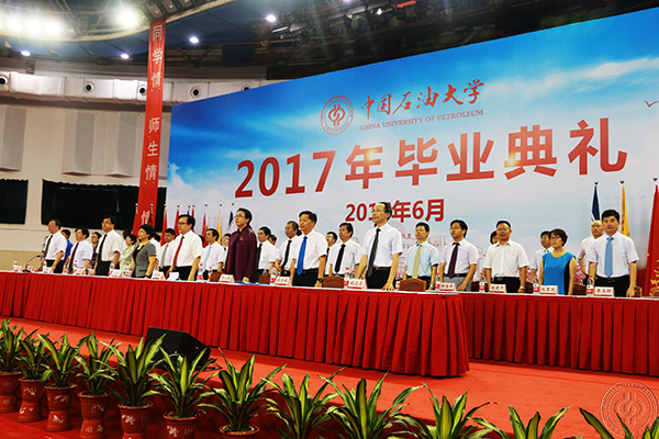 6月29日上午,中国石油大学在体育馆举行2017年毕业典礼,为顺利完成学业的3817名石大学子送上诚挚的毕业祝福。校领导山红红、张来斌、刚文哲、雷玉江、吴小林、庞雄奇、张士诚,副校级干部鲍志东,以及各学院(研究院)、相关职能部门负责人,教师代表、毕业生代表、在校学生代表、毕业生家长代表和校友代表参加了典礼,共同见证2017届毕业生开启人生新的篇章。毕业典礼由党委副书记雷玉江主持。