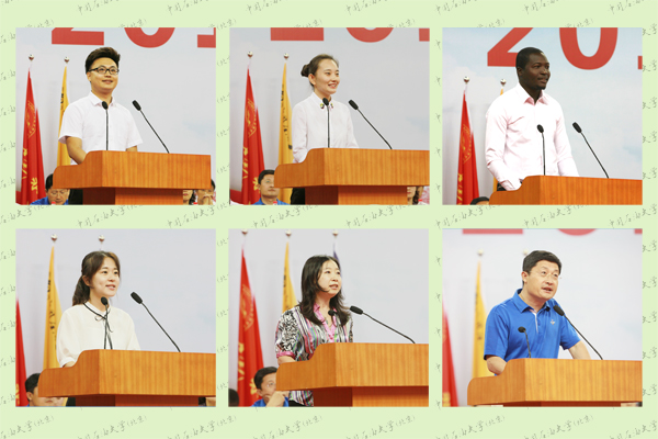 毕业本科生代表石油工程学院吴贵伦、毕业研究生代表工商管理学院袁省之、毕业留学生代表乍得籍留学生帕帝楠分别发言,他们深情讲述了自己对石大的热爱与感激,表达了对未来的美好期许;在校学生代表外国语学院马甜甜感谢学长学姐的帮助与支持,祝福学长学姐未来一帆风顺、前程似锦;教师代表工商管理学院赵晓丽表达了对毕业生浓浓的牵挂和不舍,送上了深情的祝福和嘱托;校友代表郭海波分享了自己的励志创业故事,寄语毕业生要趁着如诗年华,趁着满腹学识,趁着对未来的美好期望而努力奋斗。