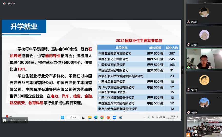 2月23日晚,中石大安全与海洋工程学院组织研究生招生宣讲会。此次宣讲会面向华北水利水电大学200余名学子线上开展。