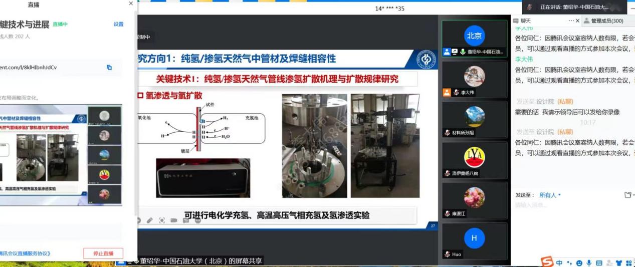 为普及长输管道掺氢/纯氢输送安全领域的新技术,促进行业交流和发展,7月8日上午,中国石油大学(北京)管道技术与安全研究中心主任、安全与海洋工程学院教授董绍华受中国特种设备安全与节能促进会邀请,采用线上直播的方式作了题为《氢能输送安全关键技术与进展》的报告,介绍了氢能输送研究领域最新成果、关键技术与进展,并就相关技术和与会人员展开研讨。线上,近百家单位共千余人参与了此次主题报告的直播。