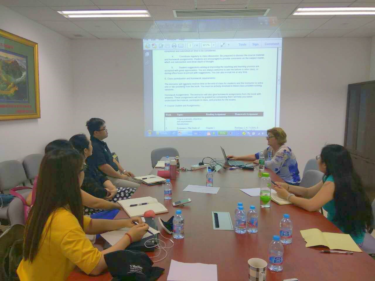 2017年6月2日,工商管理学院召开第三次全英文教学团队讨论会。本次讨论会由Monica Thiel博士向大家介绍美国的课程体系,以本科课程《经济学原理》为例,向大家展示英文教学大纲、教材、教学幻灯片的样例。
