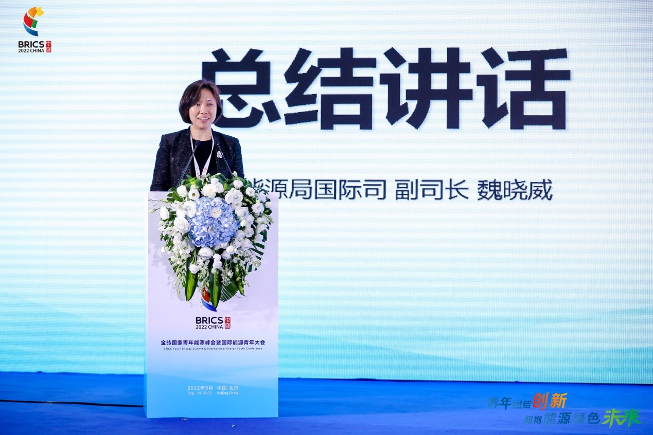 国家能源局国际司副司长魏晓威作总结讲话。她代表主办单位国家能源局,对各有关单位的大力支持和积极参与表示感谢,对中国石油大学作为中国能源学科领域领军高校之一的责任担当和世界眼光表示肯定。她指出,此次峰会促进了能源合作与高校教育的融合发展,加强了金砖国家青年的学术合作、联合实践活动,打开了金砖国家及其他国家青年能源合作的友谊之门。