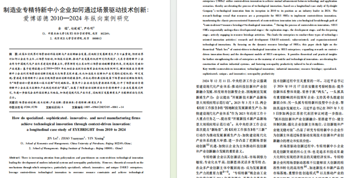 该案例研究论文基于爱博诺德公司2010—2024年从初创企业到行业领军企业的纵向案例展开分析,解析制造业专精特新中小企业利用场景驱动创新实现技术与场景互促并进,从而加速技术创新和产业突围的过程机理。研究发现:资源是专精特新中小企业实现场景驱动创新的前提条件,并由此将经典过程视角下场景驱动创新框架转化为“场景驱动—资源拼凑—技术创新”的突破路径。聚焦中小企业动态化资源拼凑问题,打开了场景驱动专精特新中小企业技术创新和产业跃迁的理论“黑箱”,拓展了场景驱动创新理论和专精特新中小企业发展模式研究,为进一步强化企业科技创新主体地位,加快建设现代化产业体系,因地制宜发展新质生产力提供理论与实践启示。