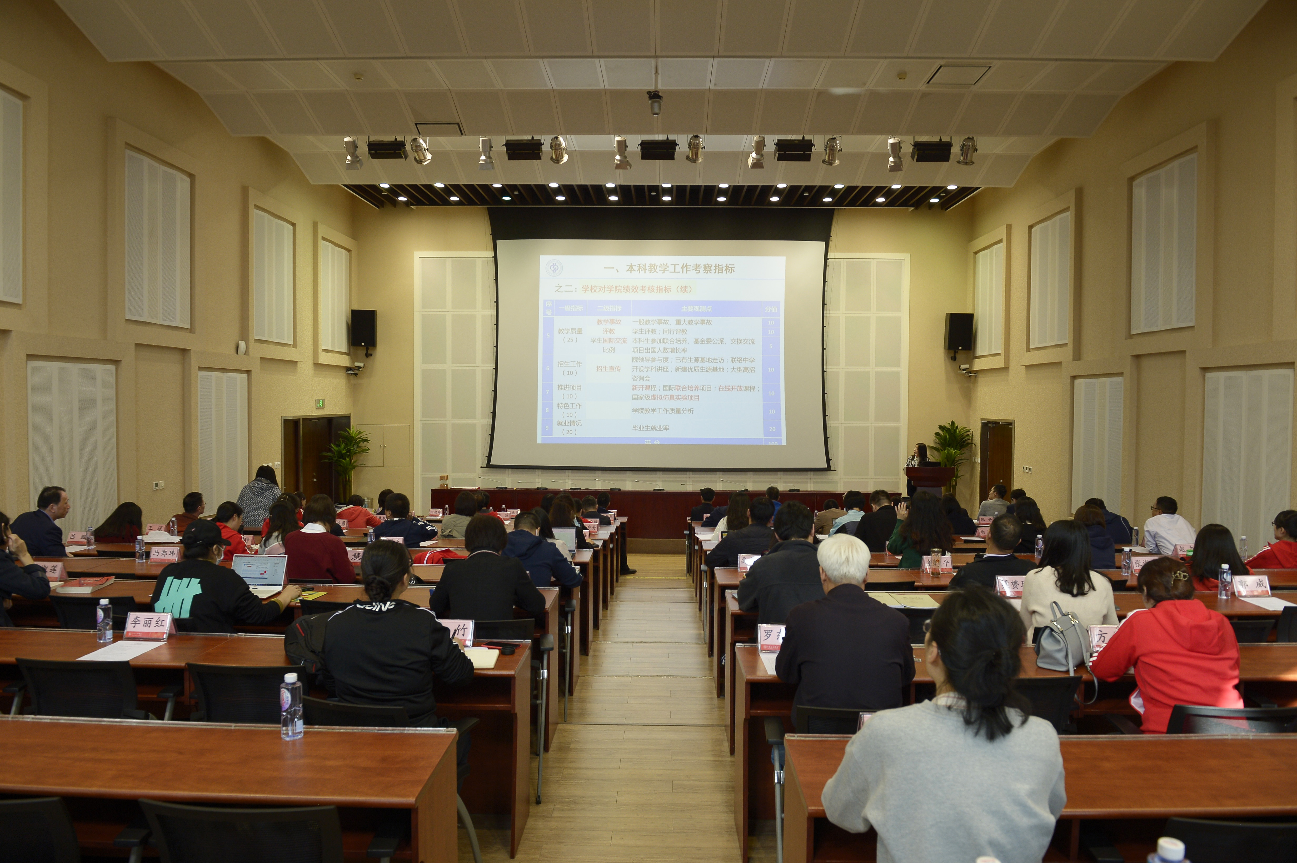副院长赵晓丽作本科教学工作质量分析报告,从教学成果奖、教学名师和教学团队、课程和教材、实验和实践、教改项目、学生培养质量、专业特色及优势、师资队伍建设、教学质量、招生宣传十个方面汇报了本科教学工作质量总体情况。她指出,学院存在缺乏教学名师、缺乏精品课程和精品教材、缺乏有特色的实验和实践环节、缺乏有特色的教学平台建设、教学团队建设有待进一步加强等问题,并表示要在后续工作中建设精品课程、打造精品教材,提升毕业论文质量,建设现代化教学实验室,加大一流专业建设力度,推动高水平教改项目的申报。