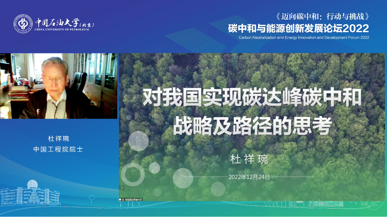 杜祥琬院士作了题为“对我国实现碳达峰碳中和战略及路径的思考”的主旨报告。他阐述了对碳达峰和碳中和的三个基本判断和认识。实现碳达峰碳中和是顺应绿色发展时代潮流、推动经济社会高质量发展、可持续发展的必由之路;我国碳达峰碳中和面临的困难和挑战主要是减排幅度大、转型任务重、时间窗口紧;我国通过加快推动技术进步和发展转型,可以实现高质量碳达峰和如期碳中和。他提出包括产业结构优化升级、能源体系清洁低碳安全高效、新型电力系统安全可靠、工业部门电气化和深度脱碳、交通部门燃料替代、建筑部门节能创新、碳移除技术创新、减污降碳统筹融合在内的实现双碳目标的八大路径。