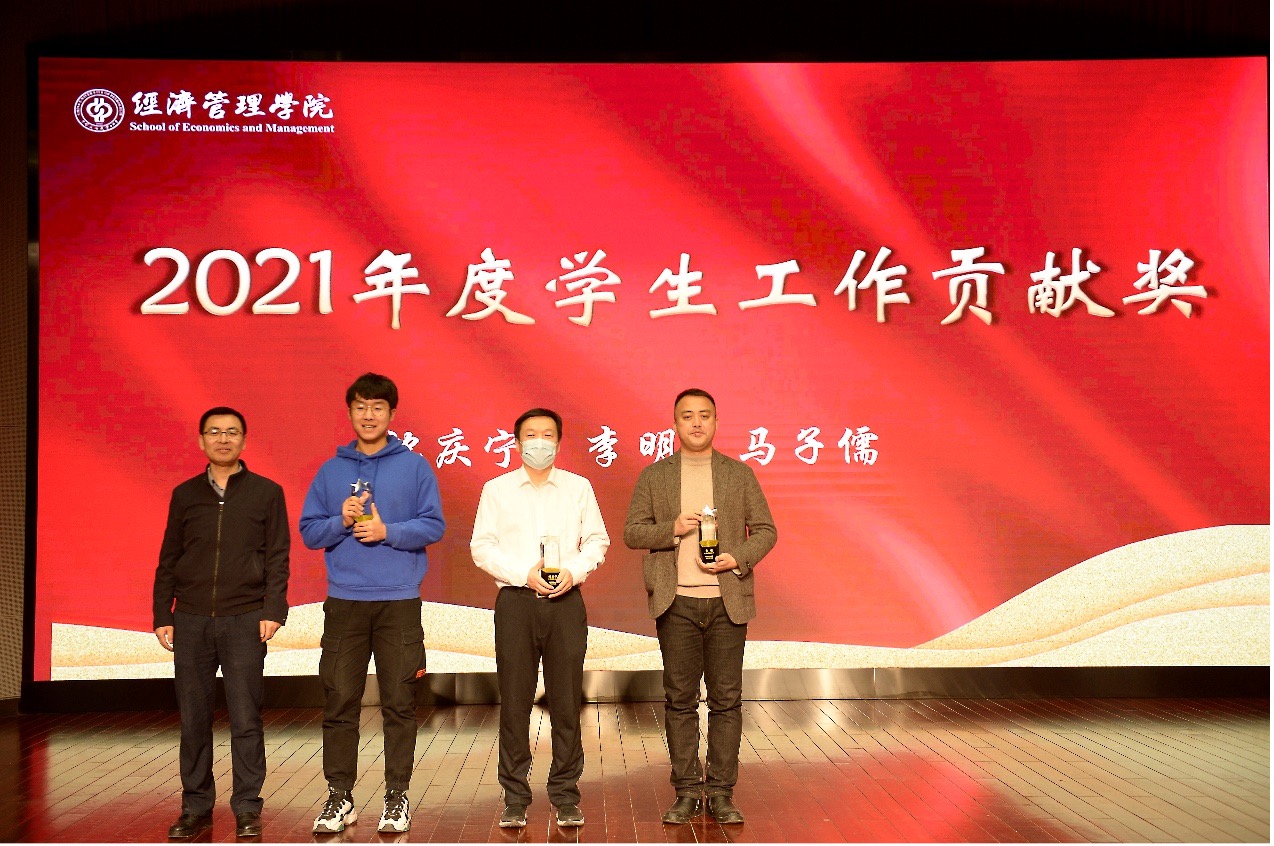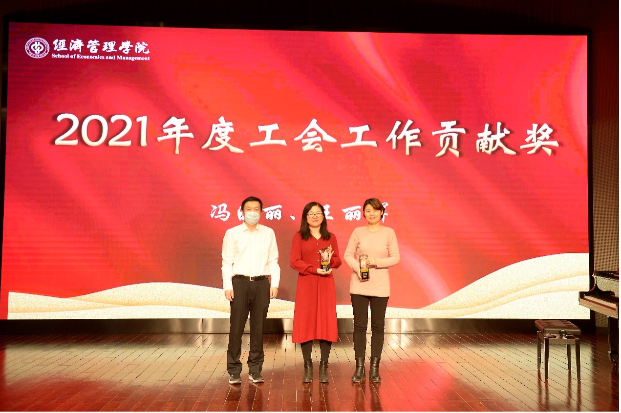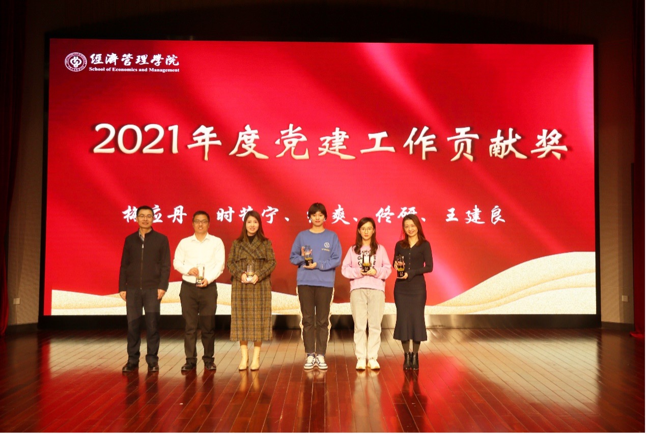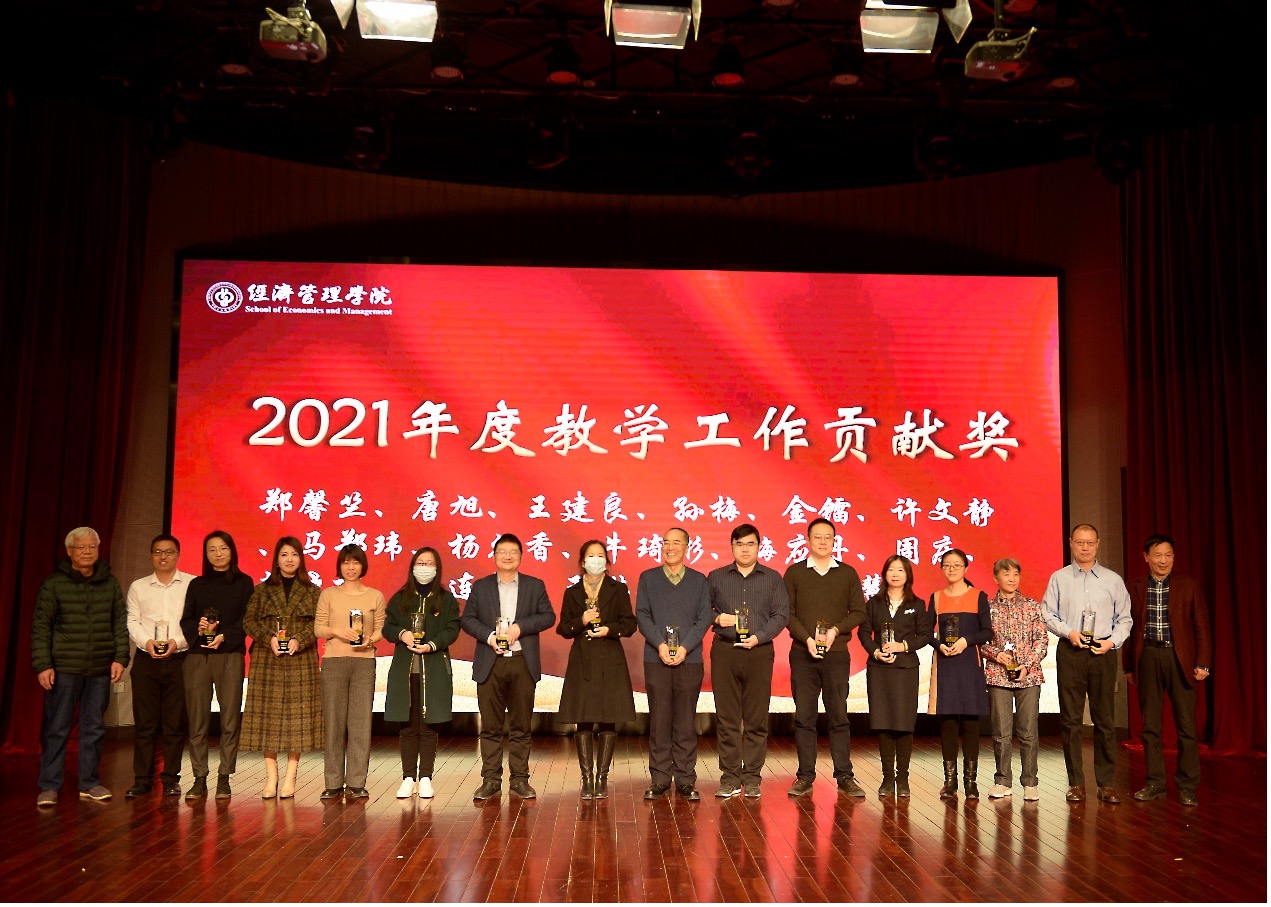 朱义清宣读了关于表彰2021年度经济管理学院各项工作突出贡献奖和贡献奖获得者的决定,对在党建、科研、教学、人才、公共服务、学生工作、工会工作等作出突出贡献和在院内教学比赛中获奖的老师进行表彰并颁发了奖杯和证书,激励全院教职工以先进为榜样,积极进取,开拓创新。
