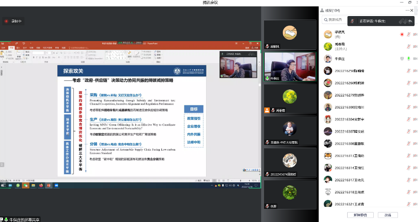 围绕“政府-供应链”之间的降碳减排政策和企业应对配合这一研究主题,牛教授介绍了三篇研究。他分别从采购-生产-分销三个代表性环节提炼科学问题,构建竞合博弈模型,找出企业增收与降碳减排帕累托改进空间,展开具体的探索性研究,并对管理启示进行了总结,其一为考虑零配件回收补贴和成品碳税的再制造竞合供应链协调策略;其二为考虑碳锁定难题的跨国公司离岸生产和转厂筹划策略;其三为考虑欧盟“碳中和”规制的新能源车和燃油车竞合分销策略。