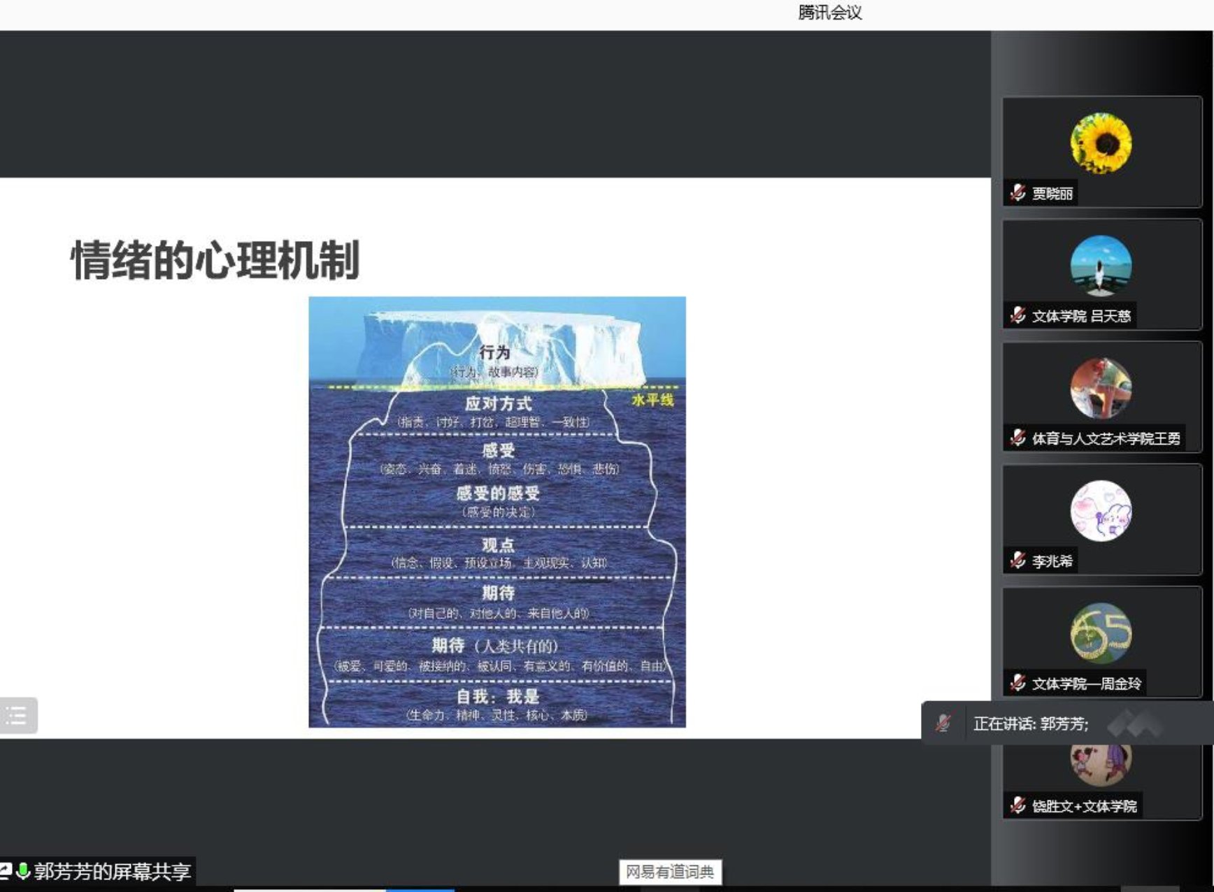 为了帮助学院教师更好地应对生活、工作等方面的压力,做好情绪管理,建立健康的心理状态,体育与人文艺术学院与机械与储运工程学院于12月2日联合举办了线上心理健康辅导讲座。本次讲座邀请了北京师范大学发展与教育心理学博士、国家二级心理咨询师郭芳芳老师,文体学院和机械学院近百位教师参加了本次讲座。