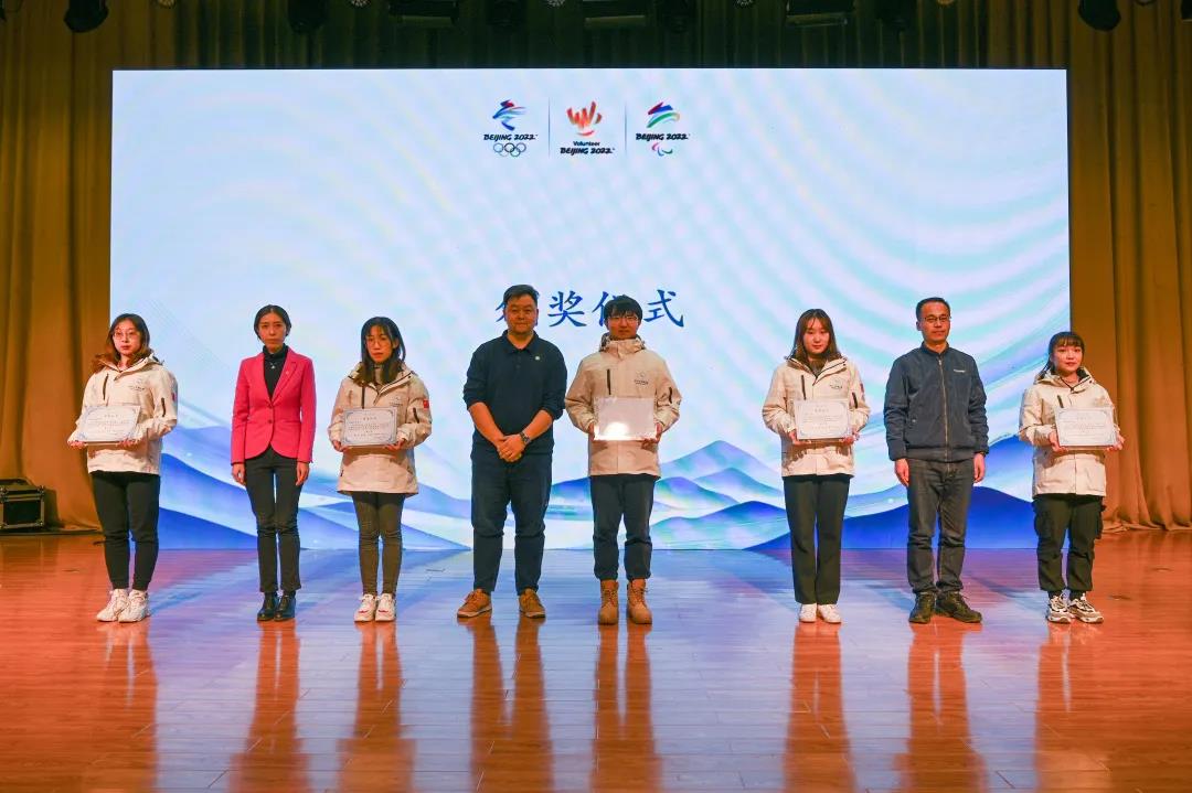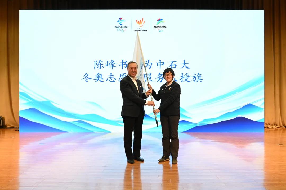 陈峰为冬奥志愿者服务队授旗,北京冬奥延庆冬奥村(冬残奥村)场馆运行团队志愿者经理、学校心理健康教育及咨询中心主任邓听接旗