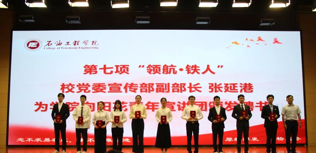 2022年暑假,石油工程学院组织开展第四期“铁人精神训练营”,学院青年学生积极投身社会课堂,将小我融入大我,把青春献给祖国,取得了良好的育人效果和积极的社会反响。经评比展示,涌现出16支优秀团队。在“领航·表彰”环节,刘东东宣读社会实践优秀团队表彰决定,研究生工作部副部长张松为获奖团队代表颁发证书。