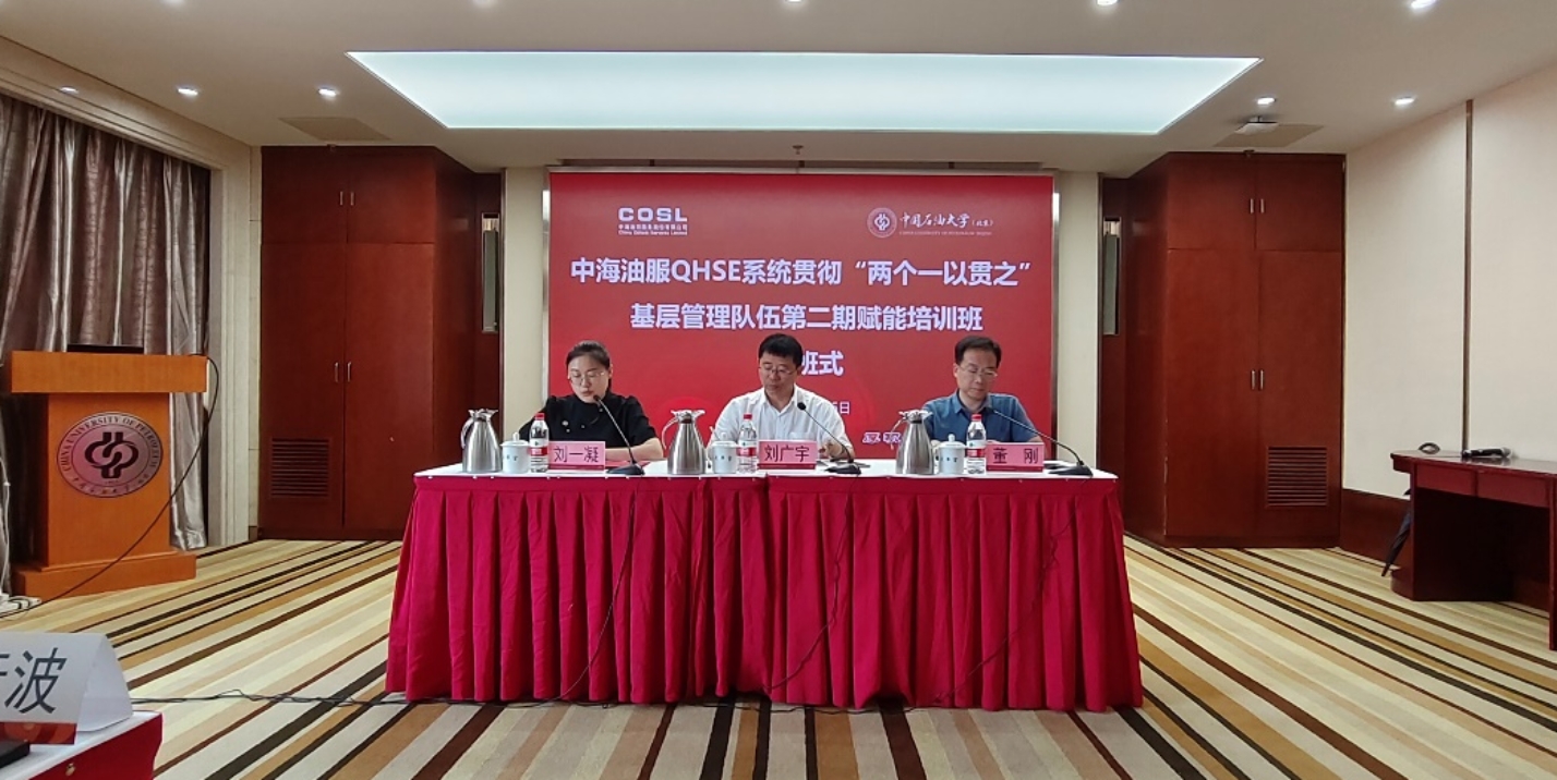 2024年8月5日,由我校承办的中海油服QHSE系统贯彻“两个一以贯之”基层管理队伍第二期赋能培训班在翠宫第五会议室举办开班式。中国石油大学(北京)网络与继续教育学院副院长刘一凝、中海油田服务股份有限公司质量安全部岗位经理刘广宇出席开班式并讲话。