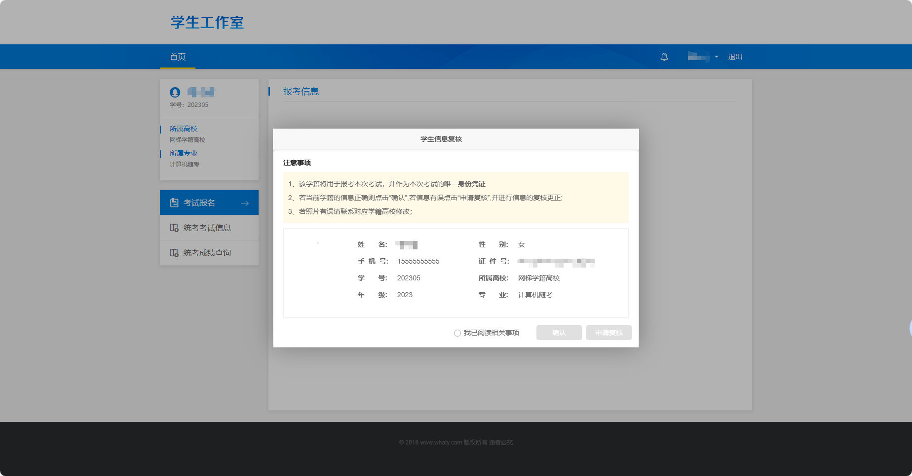 登录完成后,系统会弹出“确认学籍”信息窗口,请考生认真核对姓名、身份证号码、照片等信息,保证个人信息的真实、准确、有效,确认无误后点击“确认”。如信息有误可点击“申请复核”进行信息更正申请。(如考生照片有误,则需联系所在学习中心申请修改。)