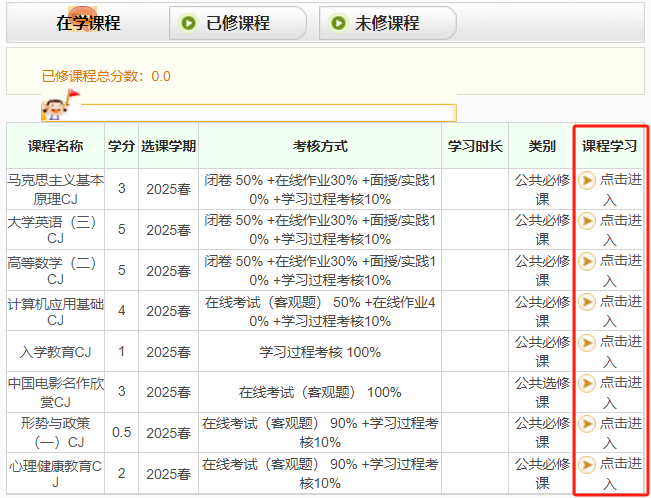 2025级成人教育学生本学期新选的课程共8门,如下表所示: