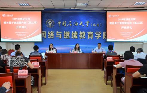 2019年5月20日上午,由我校网络与继续教育学院承办的“中海石油炼化有限责任公司2019年炼化公司财务骨干素质提升班(第二期)”在高端培训中心第二报告厅隆重开班。委培方领导中海石油炼化有限责任公司财务部副经理张静、中国石油大学(北京)网络与继续教育学院副院长刘玉平出席开学典礼并讲话。