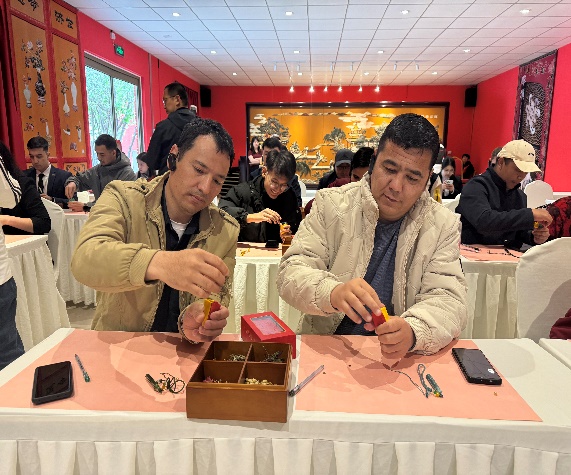活动中,与会嘉宾们参观了北京金漆镶嵌艺术博物馆,近距离感受燕京八绝宫廷技艺。民建石景山区工委副主委、北京金漆镶嵌艺术博物馆馆长柏群向学员们赠送了雕漆创新工艺礼品。学员们还在花丝镶嵌大师董瑞京和京绣大师刘晓燕的分别指导下,亲手体验了花丝錾刻制作技艺和京绣香囊制作技艺。