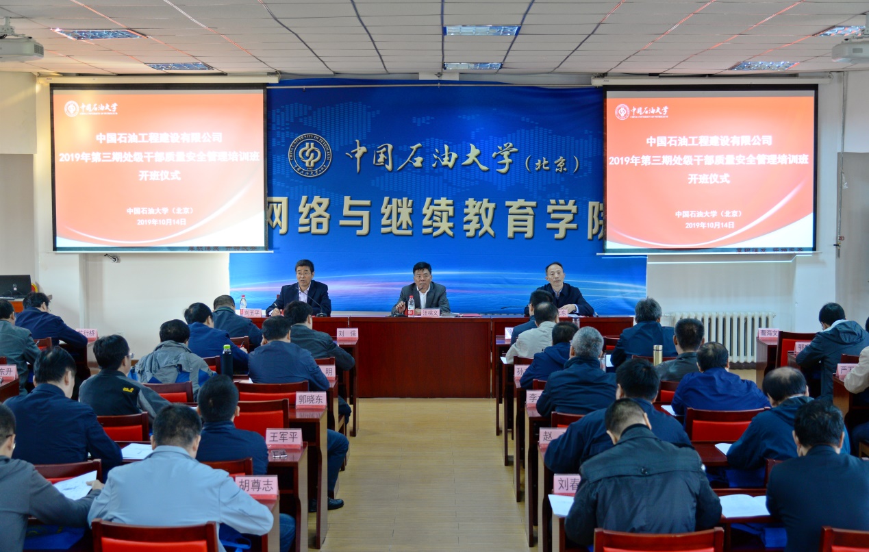 2019年10月14日,由我校网络与继续教育学院承办的“中国石油工程建设有限公司2019年第二期处级干部质量安全管理培训班”在东校园培训基地第二报告厅隆重开班。中国石油工程建设有限公司副总经理汪桃义,中国石油大学(北京)副校长鲍志东出席开班典礼并讲话,开班典礼由中国石油大学(北京)网络与继续教育学院副院长刘玉平主持。