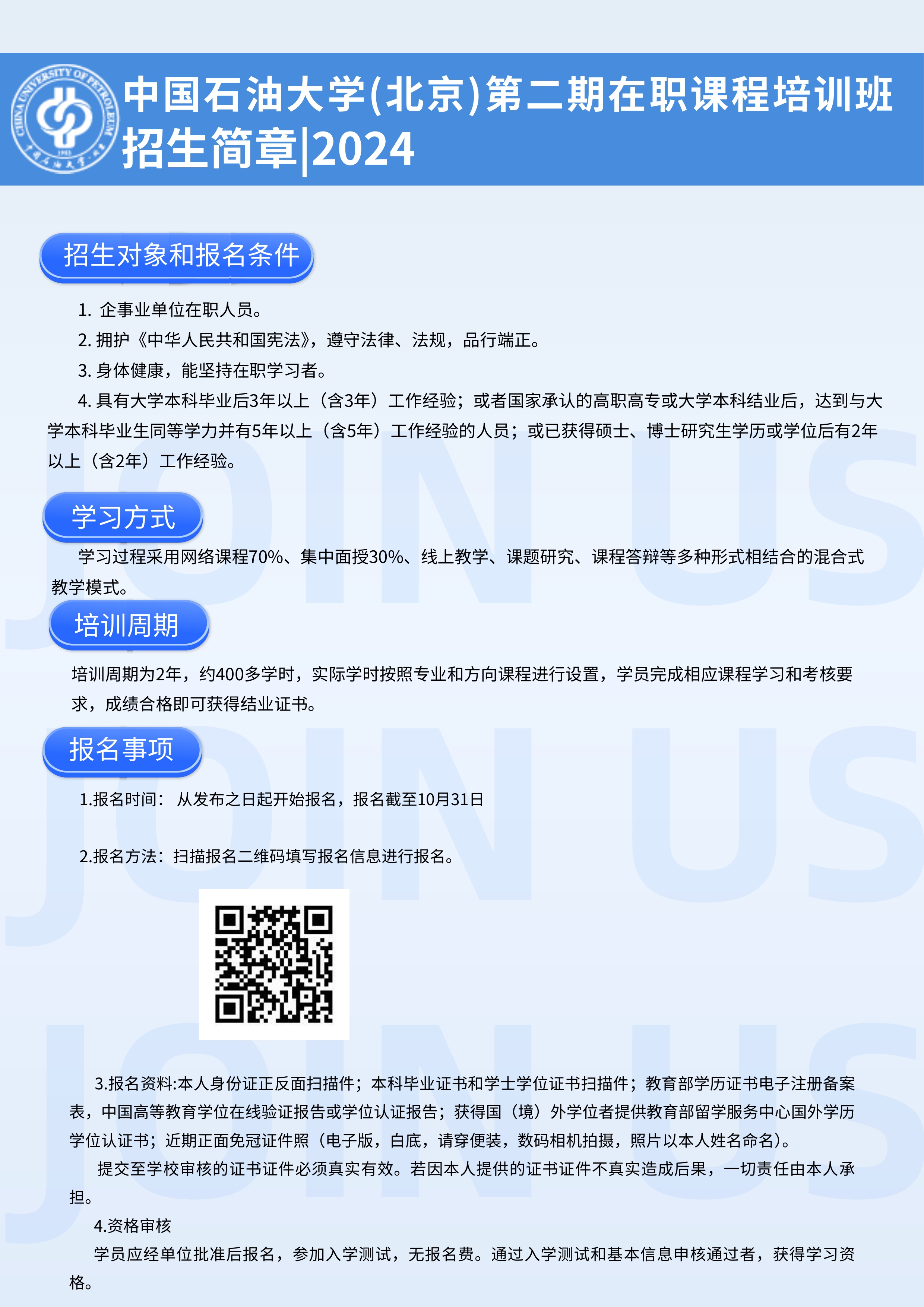 中国石油大学(北京)2024年第二期在职课程培训班招生简章