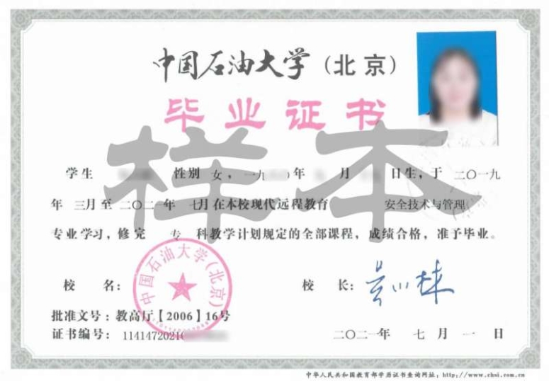 毕业证书:在2.5-5年学籍期内修满规定的学分(不低于80学分);完成毕业论文写作,且成绩为合格及以上;通过教育部组织的公共基础课(英语及计算机应用基础)考试。毕业审查通过后,由中国石油大学(北京)颁发毕业证书(国家承认学历),标注“现代远程教育”字样,并报教育部电子注册。