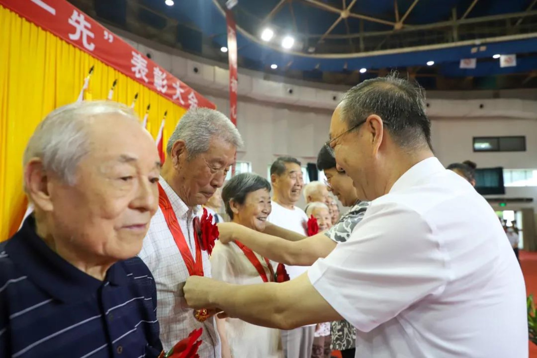 大会在雄壮的国歌声中拉开帷幕,会议首先举行了“光荣在党50年”纪念章颁发仪式,陈峰和吴小林为到会的34名老党员代表颁发纪念章,新党员代表集体为老党员献上鲜花。党委副书记雷玉江宣读了“光荣在党50年”纪念章获得者名单,学校共有90名老党员获颁纪念章。